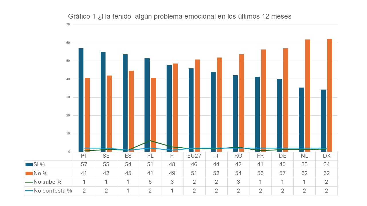 En el gráfico 1 se observan los resultados en los 11 países seleccionados y en el promedio, de manera que el 46% de los europeos ha tenido algún problema emocional, pero hay una amplitud de 23 puntos entre el país con mayor porcentaje (PT: 57%, 11 puntos por encima del promedio), y con menor (DK: 34%, 12 puntos por debajo del promedio y 23 puntos menos que PT). Por su parte, España con el 54% de mayores de 15 años que han tenido algún problema emocional en los últimos 12 meses, se sitúa 12 puntos por encima del promedio.
