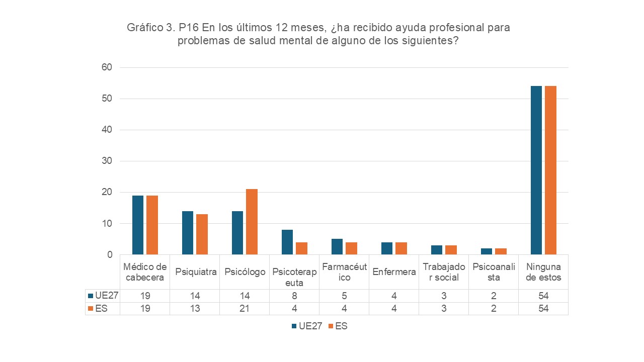 Esta pregunta iba dirigida solo a aquellas personas que habían contestado que habían tenido algún problema emocional en los últimos 12 meses (46% en UE27). Se ofrecían once opciones y se admitían varias respuestas.