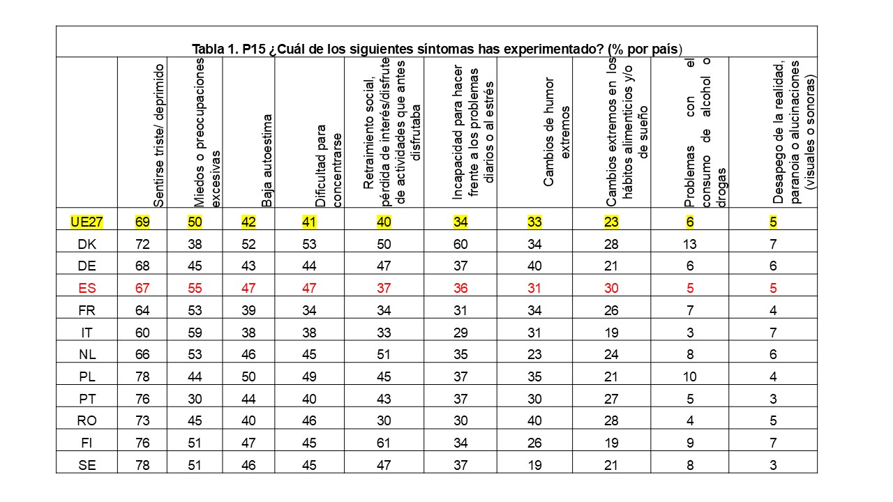 F) Respecto a los síntomas experimentados por ese 46% que manifestó haber tenido algún problema emocional, en todos los Estados miembros, el sentimiento de tristeza o depresión es el síntoma más frecuentemente mencionado. La proporción de personas que seleccionan esta respuesta oscila entre el 60% en Italia y el 78% en Polonia y Suecia, con un promedio en la UE27 del 69%. España está dos puntos por debajo de la media.