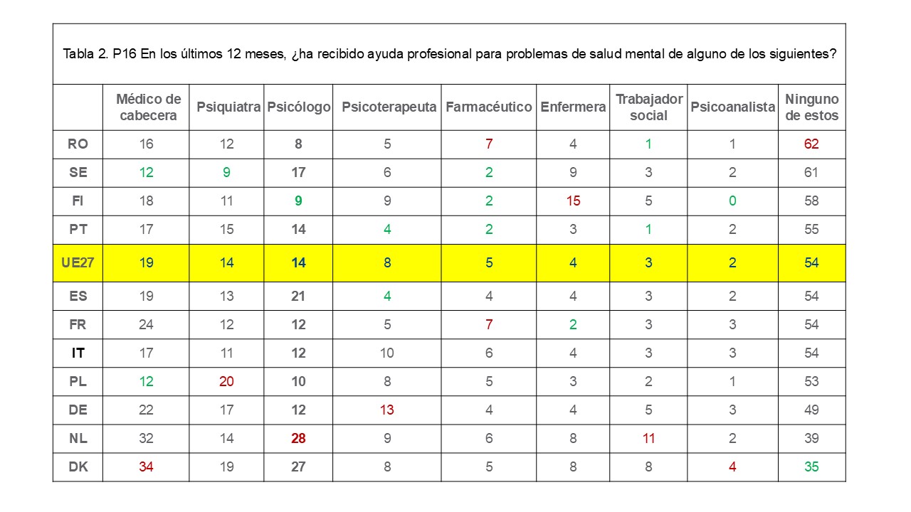 A los encuestados que informaron haber enfrentado un problema emocional en el último año también se les preguntó si habían recibido asistencia de una lista específica de profesionales. Más de la mitad de estos encuestados (54%) responden que no han recibido ayuda de los profesionales que figuran en la encuesta. Entre los 11 países seleccionados, esta proporción varía entre el 35% en Dinamarca y el 62% en Rumanía, con un promedio del 54%, que es el mismo porcentaje de España.