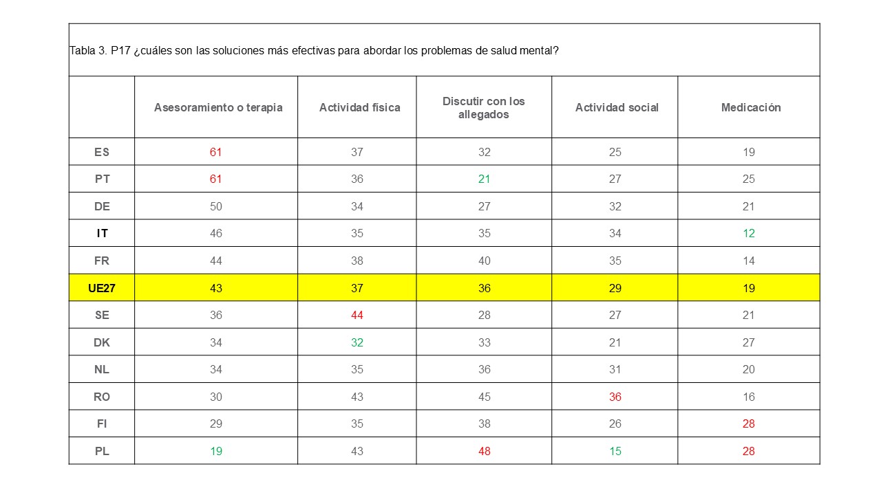 «En 6 de los 11 Estados miembros seleccionados (España, Portugal, Alemania, Italia, Francia y Dinamarca) el asesoramiento o la terapia es la solución más citada para abordar los problemas de salud mental de los encuestados. El mayor porcentaje de personas que seleccionan esta respuesta se encuentra en España y Portugal (61%), mientras que la más baja se observa en Polonia con un 19%.» decir que yo estaba completamente equivocada en cuanto a la opinión que tienen los españoles sobre la eficacia de la psicoterapia y, por supuesto, es una buena noticia el informarse sobre tales datos.
