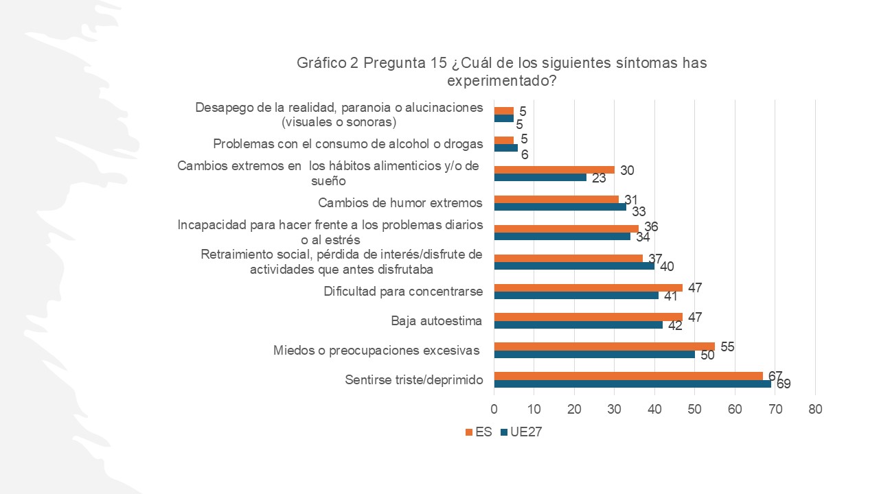 En el gráfico 2 que se recoge más abajo se compara el porcentaje de respuestas a los diferentes síntomas en la muestra española y el promedio UE27.