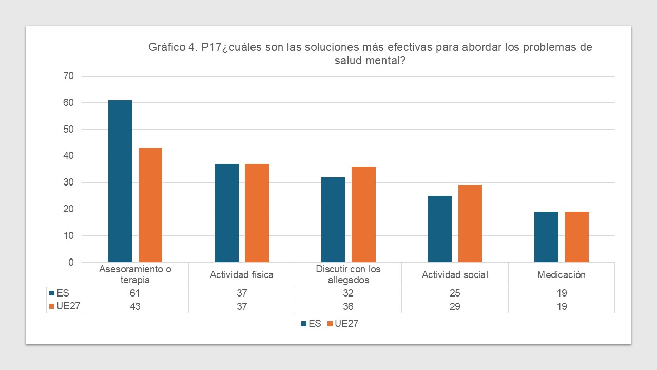 En el gráfico 4, que se recoge más abajo, se compara el porcentaje de respuestas sobre cuáles son las soluciones más efectivas para abordar los problemas de salud mental en la muestra española y el promedio UE27.
